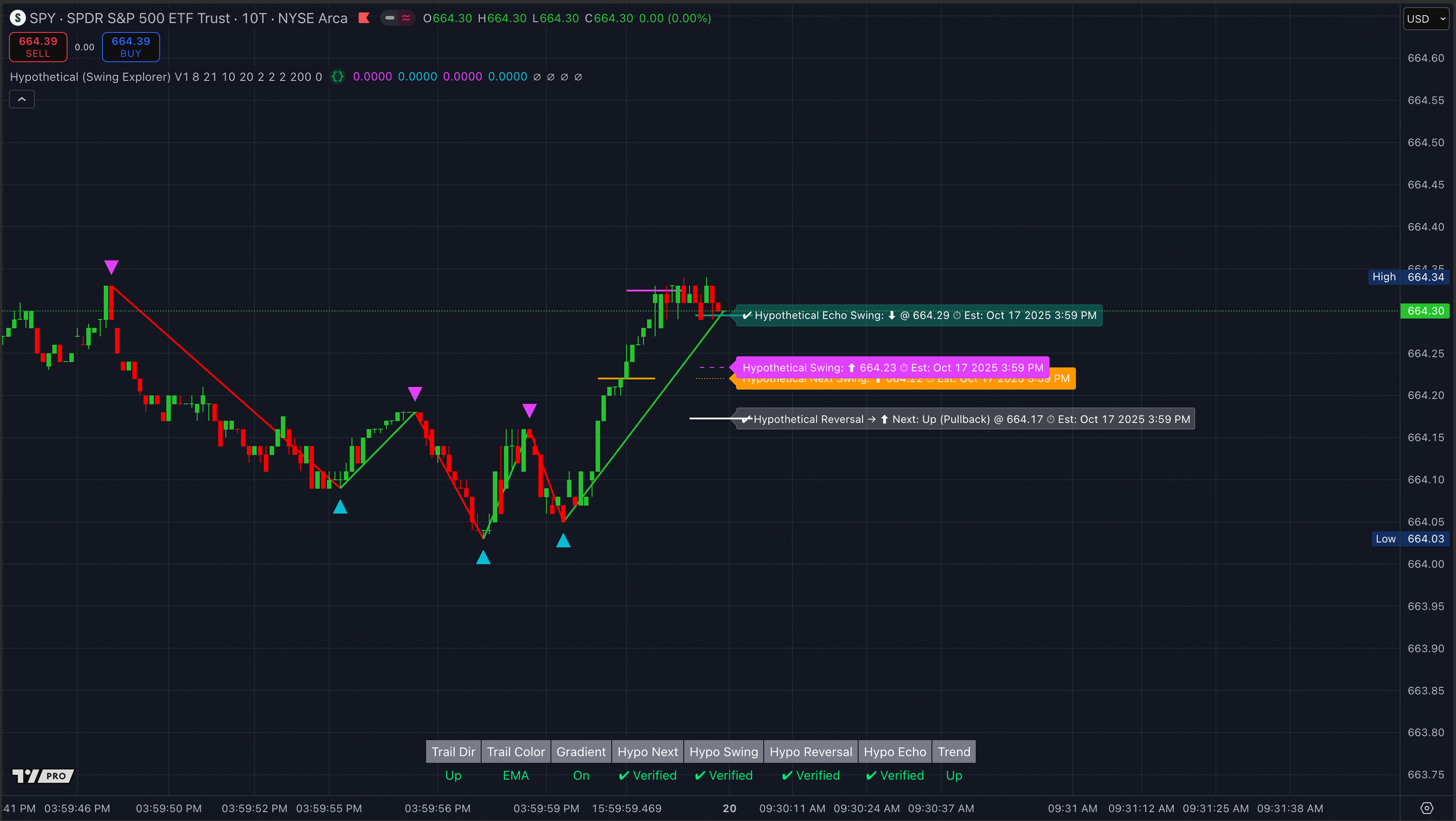 The Hypothetical (Swing Explorer) V1 is a Pine Script v6 indicator for TradingView, designed to analyze market structure and illustrate price movements. It combines a verified-pivot ZigZag (non-repainting), EMA-based trend context, pivot-anchored trail lines (with optional gradient fading and EMA/price color sync), an optional Zero-Lag guide from the last confirmed extreme, and illustrative “Hypothetical” marks (Next, Swing, Reversal, Forward Echo) with rough time estimates. A compact status table summarizes trend direction, trail state, and each hypothetical mark’s Pending/Verified status—useful when reviewing commonly watched swing scenarios